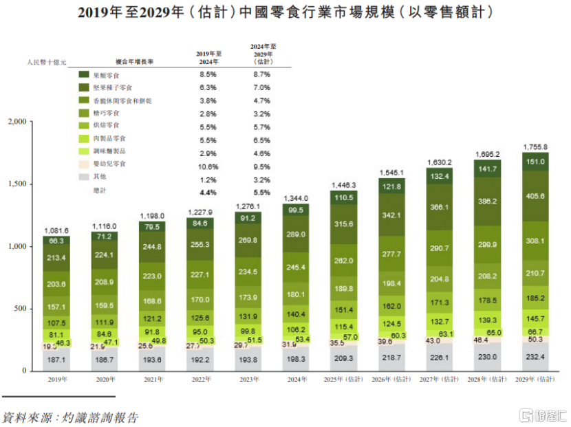 2024年中国零食行业市场规模达到1.34万亿元,预计到2029年将增长至1.76万亿元,2024年至2029年的复合年增长率为5.5%。