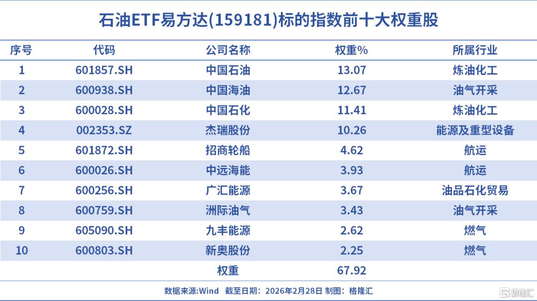 如今天上市的石油ETF易方达(159181)跟踪国证石油天然气指数,在行业结构上,更偏向于中上游,资源属性强,成份股中三桶油(中国石油、中国石化、中国海油)占比达37.15%,燃气含量13.7%。
