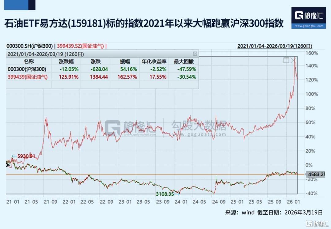 国证油气指数2021–2025年五个完整年度收益率分别为33.93%、0.05%、7.01%、10.90%、10.13%。截至2026年3月19日,国证油气指数2021年以来涨幅125.91%,同期沪深300指数跌12.05%。