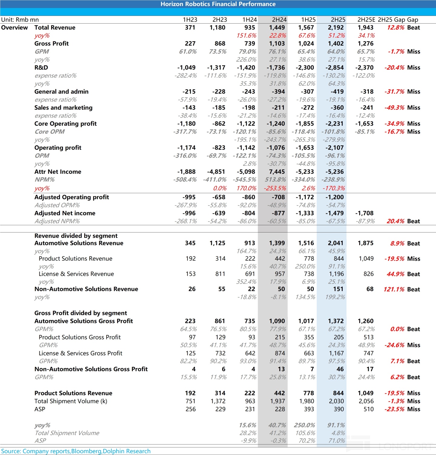 1)收入端超预期,但核心芯片业务收入低于预期:2H25 地平线总收入 21.9 亿,同比增速 51.2%,超市场预期 19.4 亿。