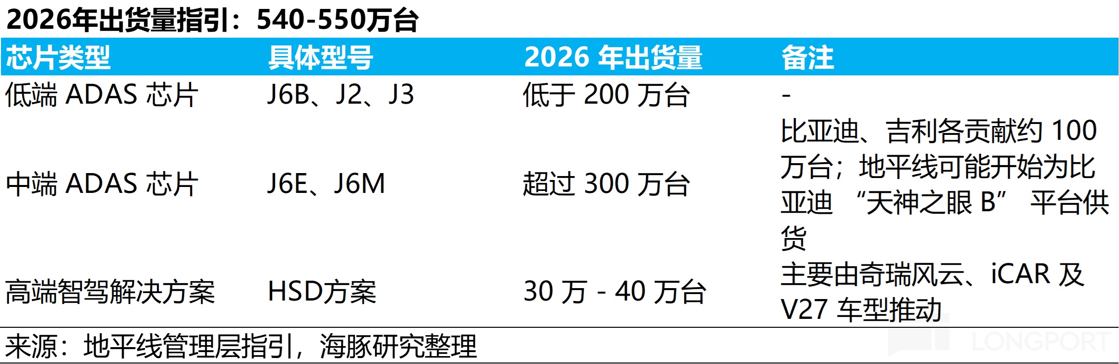 中端 ADAS(J6E/M): 突破 300 万颗。管理层预计比亚迪和吉利将各自贡献约 100 万颗销量,且地平线将在 2026 年打入比亚迪 “天神之眼 B” 智驾体系。