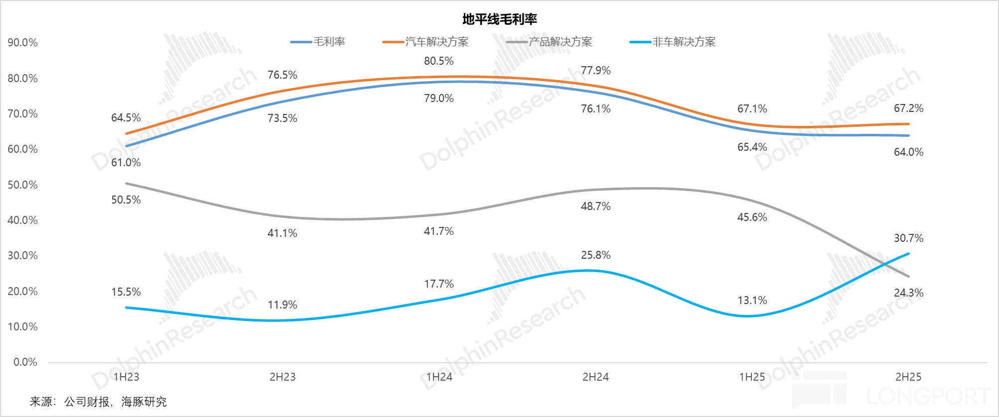 3)毛利率骤降:战略性的 “系统级交付” 与掩盖不住的竞争压力:2H25 整体毛利率 64%,环比下滑 1.4 个百分点,低于预期的 65.7%。尽管高毛利(97.5%)的授权业务占比提升,但产品解决方案业务毛利率从 1H25 的 45.6% 骤降至 24.3%,严重拖累全局。海豚君认为骤降的毛利率主要有两方面原因: