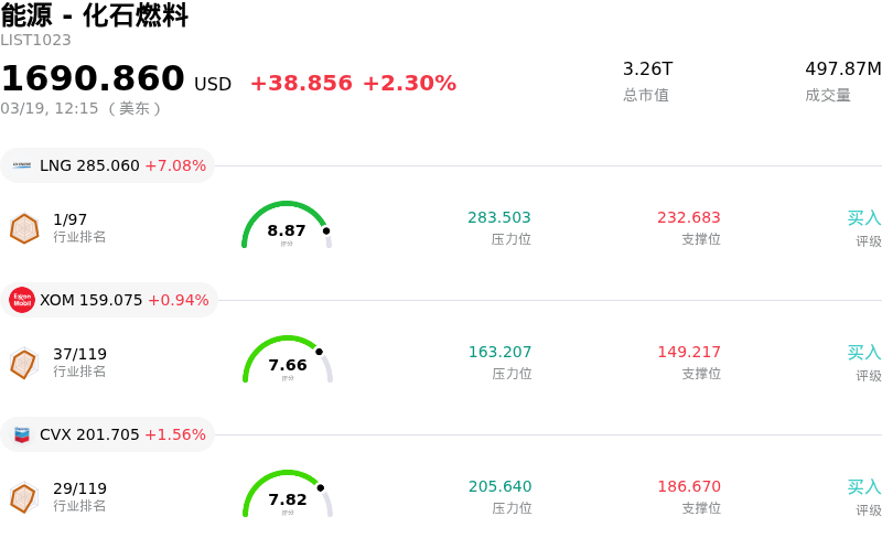 英国石油 (BP) 盘中上涨4.27%, 所属行业能源 - 化石燃料上涨2.30% ,公司涨幅跑赢行业涨幅,行业成交额前三股票 Cheniere Energy Inc (LNG) 上涨 7.08%;埃克森美孚 (XOM) 上涨 0.94%;雪佛龙 (CVX) 上涨 1.56%。