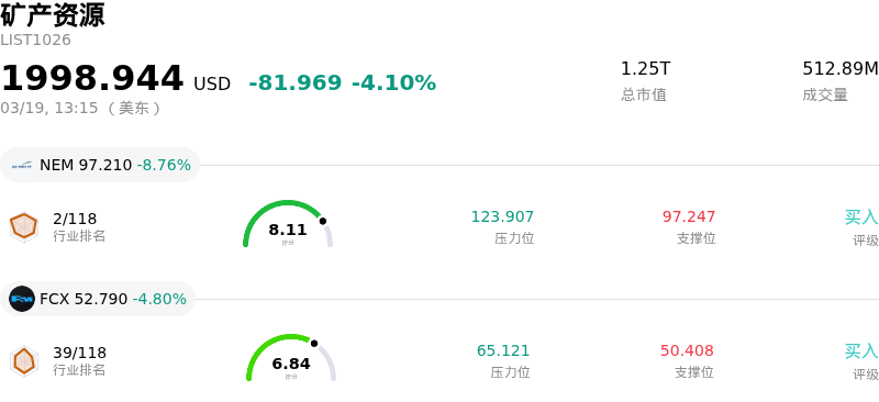 纽蒙特 (NEM) 盘中下跌8.76%, 所属行业矿产资源下跌4.10% ,公司涨幅跑输行业涨幅,行业成交额前三股票 纽蒙特 (NEM) 下跌 8.76%;自由港麦克莫兰 (FCX) 下跌 4.80%;Barrick Mining Ord Shs (B) 下跌 6.95%。