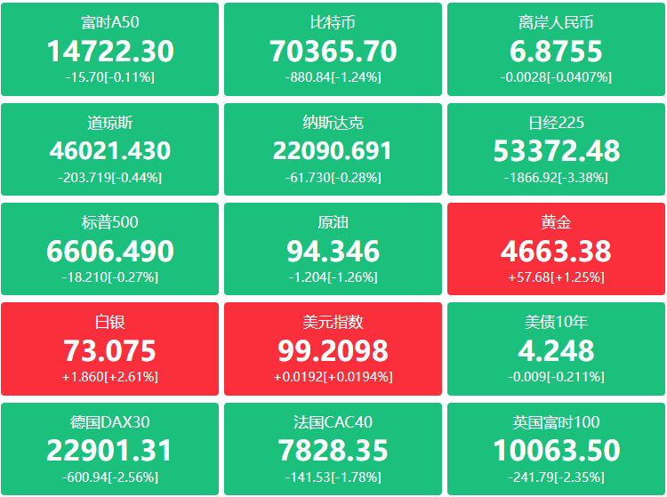 期货:现货黄金跌3.42%报4653.01美元,黄金期货跌4.86%报4657.80美元;现货白银跌3.33%报72.85美元,白银期货跌6.29%报72.840美元,铜期货涨0.46%报5.5240美元,现货铂金跌2.54%;原油期货跌0.18美元,跌幅超过0.18%报96.14美元,布伦特原油涨1.27美元,涨幅超1.18%报108.65美元;天然气期货报3.1660美元,汽油期货报3.1271美元,取暖油期货报4.3420美元。