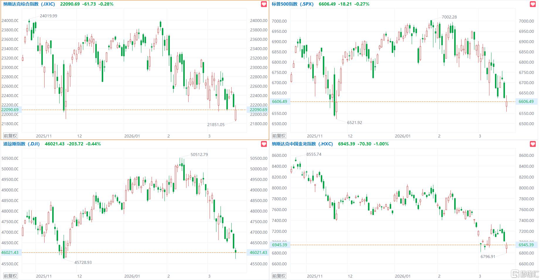 1、美股三大指数继续下行,黄金矿业股领跌纽曼矿业跌近7%,中概指数跌1%