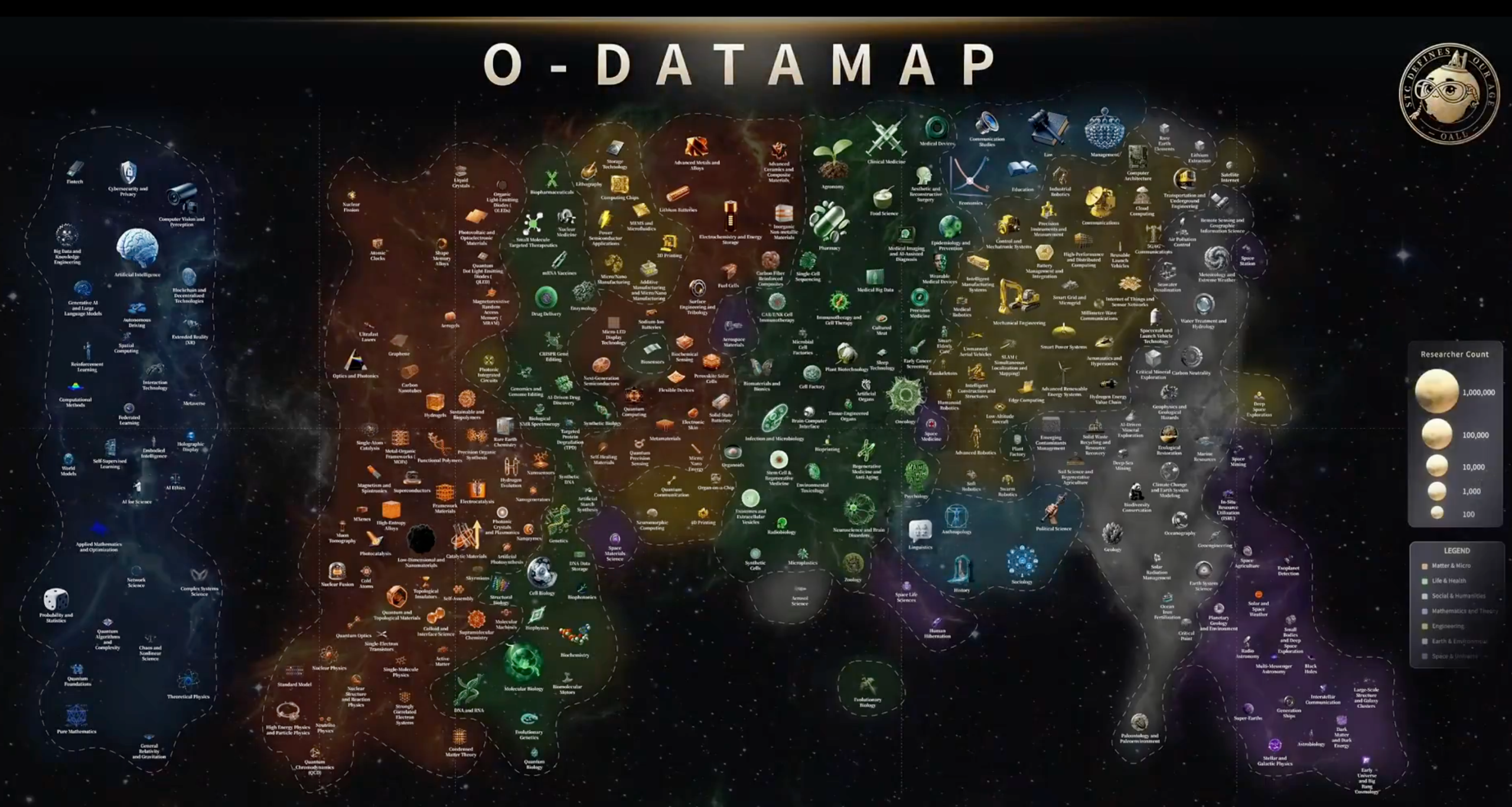 一开场,球球首先就重构了普通人对科技世界的认知,向全球观众展现了一张“科技地图”。其横轴代表了空间尺度,覆盖了从最小的夸克到宇宙边缘这41个数量级,纵轴则贯穿了发展阶段,从实验室假说到原型机再到产品化最后IPO的全周期。