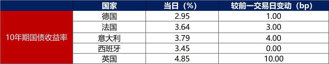 3月19日,西班牙10年期国债收益率保持不变,其余主要欧洲经济体10年期国债收益率普遍上行。其中,德国10年期国债收益率上行1bp至2.95%,法国、意大利、英国10年期国债收益率分别上行3bp、4bp和10bp。