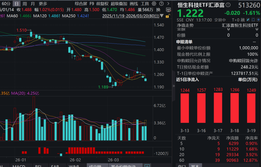 今日(3.20),港股科技板块回调,消息面上,全球地缘风波不断,阿里财报连续三个季度“增收不增利”。100%纯度的港股通科技ETF汇添富(520980)放量回调逾2%,盘中成交额已超4亿元!同类唯一15BP最低档管理费的恒生科技ETF汇添富(513260)亦跌超1.6%,资金连续“顶格”净申购,近20日累计净流入超2.9亿元!