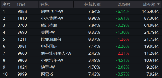 港股科技热门股多数回调:阿里巴巴-W、小米集团-W跌超6%,小鹏汽车-W跌超4%,中芯国际、快手-W跌超2%,美团-W跌超1%,腾讯控股微跌。