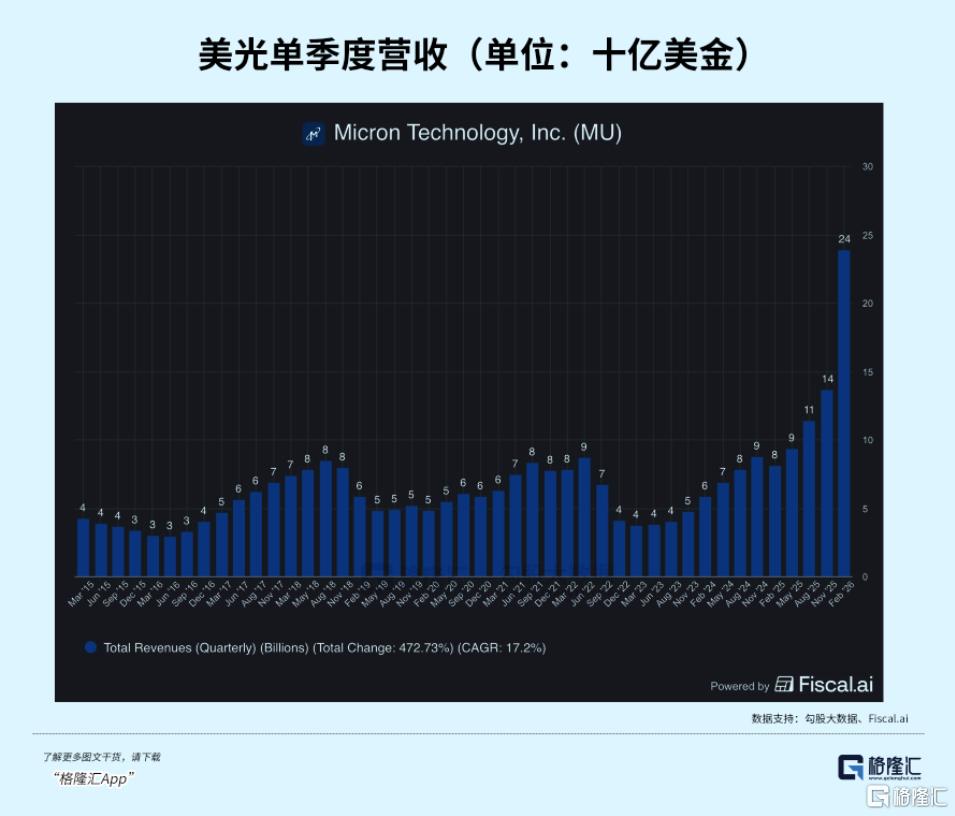 本季度(FY26Q2),美光营收达到239亿美元,环比增长75%,同比增长近200%。这个数字有多夸张?单季度的收入已经超过了FY24之前任何一年的全年营收。