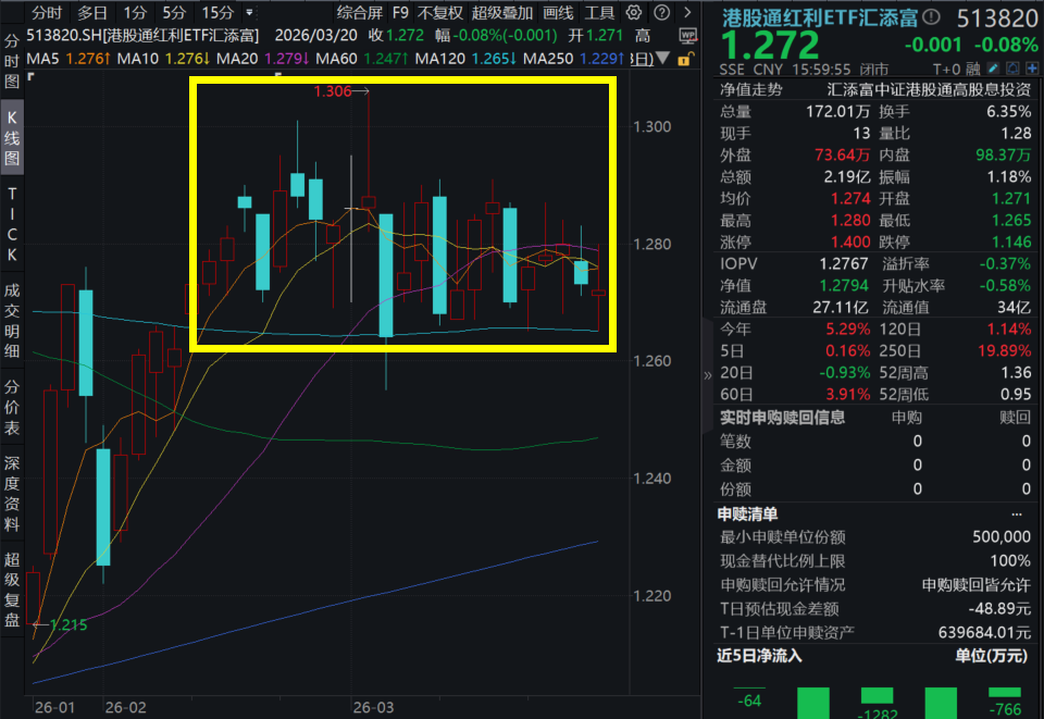 3月20日,A股市场震荡回调,现金流板板块震荡,港股红利板块逆势冲高!截至15:00,“港股高股息标杆”港股通红利ETF汇添富(513820)微跌0.08%,震荡行情中更显韧性,A股方面,现金流ETF汇添富(159276)随市收跌1.05%。