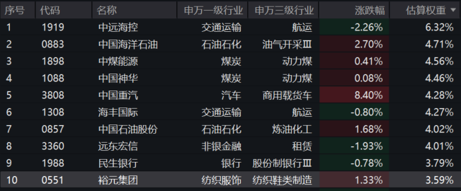 港股通红利ETF汇添富(513820)标的指数成分股涨跌不一,中国重汽涨超8%,中国海洋石油涨超2%、中国石油股份、裕元集团涨超1%,中远海控、海丰国际等涨幅居前。
