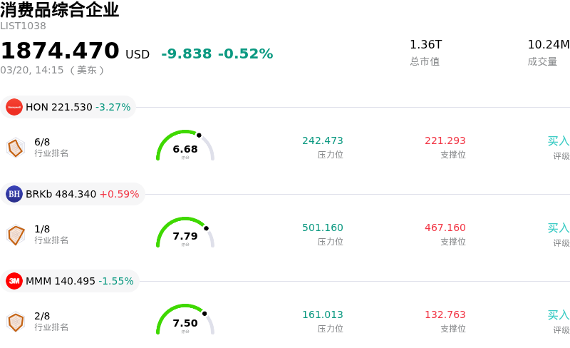 霍尼韦尔 (HON) 处于消费品综合企业行业,最新年度营业收入$37.44B,处于行业3,净利润$5.14B,处于行业3。「公司简介」