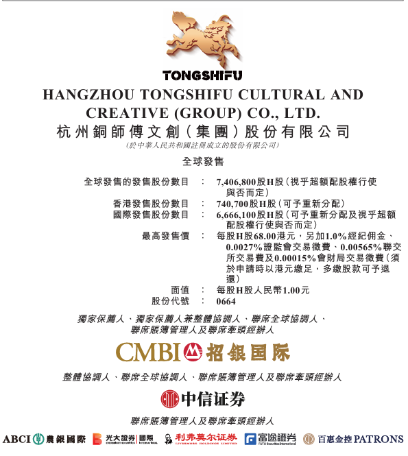 杭州铜师傅文创(集团)股份有限公司(00664.HK)于2026年3月23日正式启动H股招股,招股价区间为每股60至68港元,每手100股,入场费6,868.57港元,预计于2026年3月31日在港交所主板挂牌上市。本次拟全球发售7,406,800股,按发售价中位数64港元计算,募集资金约4.74亿港元。