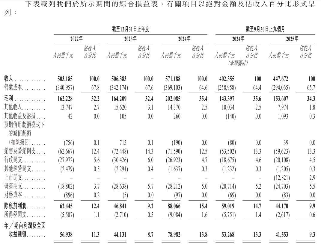 收入端来看,公司总收入从2022年的5.03亿元增长至2024年的5.71亿元,年复合增长率约6.7%;2025年1-9月实现收入4.48亿元,保持稳定。细分产品中,铜质文创产品是绝对核心,2022-2024年营收从4.80亿元增长至5.51亿元,占比均超过95%,其中铜质摆件占比达85%以上,是铜质产品的核心细分。值得关注的是,黄金文创产品收入从2024年的127.4万元快速增长至2025年前九个月的949.6万元,收入占比已达2.1%,成为新的增长亮点。根据未经审核初步财务资料,2025年全年收入预计达6.17亿元,同比增长8.1%,增长势头稳健。