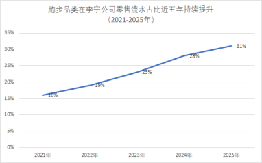 跑步品类是李宁科技研发成果转化的最佳范例,凭借持续的专业研发投入,李宁跑步品类市场势能强劲,2025年零售流水增长10%,流水占比连续5年攀升(从2021年占比16%逐步增长至2025年的31%),成为李宁第一大品类。2025年全年专业跑鞋销售超2600万双,其中核心三大跑鞋IP(飞电、赤兔、超轻)新品销量超1100万双。