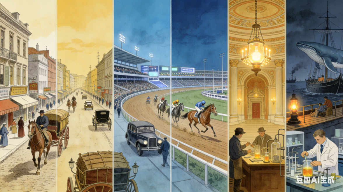 18世纪,鲸鱼油曾是高端照明燃料,彼时的凡尔赛宫便用它来营造氛围。煤油问世后开始逐步替代鲸鱼油,但早期煤油的生产成本较高,且捕鲸船队越来越少,鲸鱼油价格仍持续涨了二十年。直至提炼煤油的技术突破,鲸鱼油才被大规模替代。