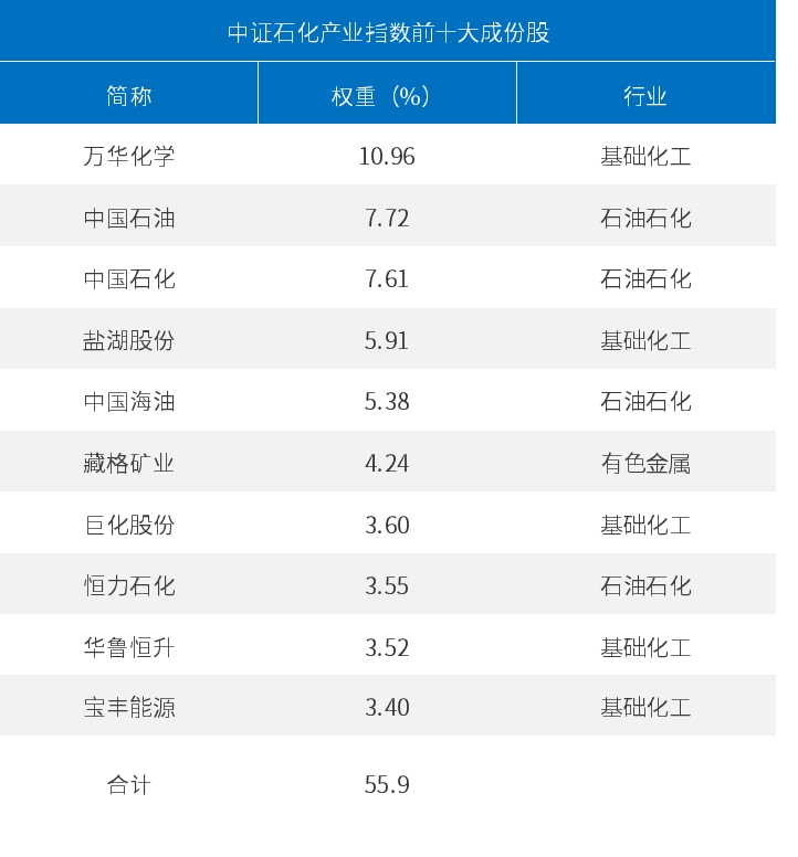 把握行情的工具:映射到投资端,可关注跟踪中证石化产业指数的化工行业ETF易方达(516570),指数中基础化工与石油炼化的权重合计超过90%,其十大成份股中既包含上游的石油石化,也包含化工中的一体化龙头万华化学等。