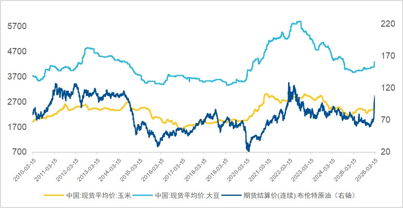 成本端复盘来看,原油价格历史上与玉米、大豆、豆油、棉花等农产品相关性较高。而需求端来看,油价上涨会直接抬升豆油、菜籽油等作为生物柴油原料的需求,将这部分农产品按照“能源原料属性”进行定价。