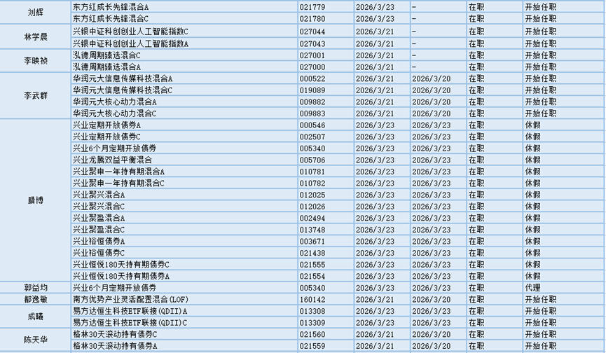 新基金经理上任方面,其中3.21-3.23日有67只基金产品发布基金经理任职公告,涉及24名基金经理。国投瑞银基金赵建现任基金资产总规模为211.01亿元,管理过的基金都为指数型基金,任职期间回报最高的产品是国投瑞银中证消费服务指数(161213),为指数型基金,在任职的7年又265天时间内获得168.17%的回报。赵建新任国投瑞银中证全指公用事业ETF联接A、国投瑞银中证全指公用事业ETF联接C这两只基金产品的基金经理。