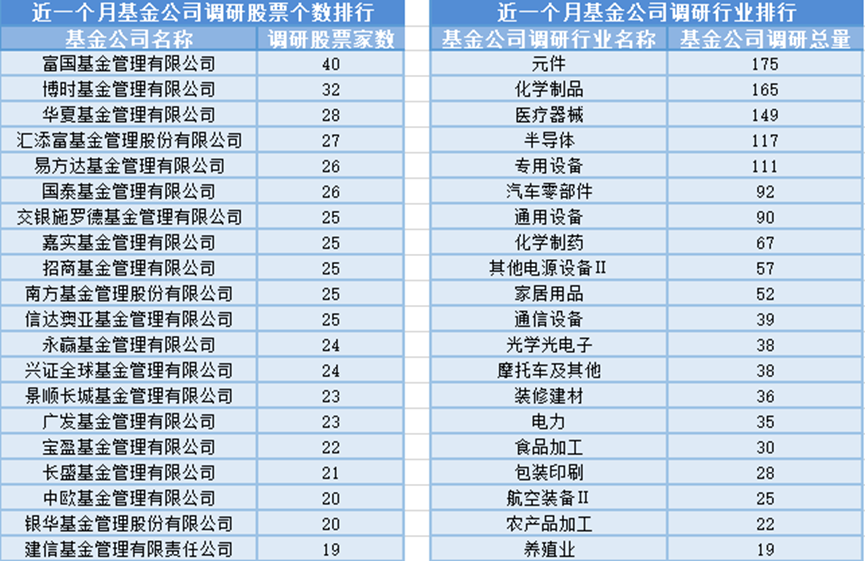 近一个月(2月21日-3月23日),富国基金参与公司调研的数量最多,共调研40家上市公司,此外调研较为活跃的还有博时基金、华夏基金和汇添富基金,分别调研32家、28家、27家上市公司;从调研行业上来看,基金公司对元件行业的上市公司调研次数最多,共有175次,其次是化学制品行业,基金公司调研了165次。