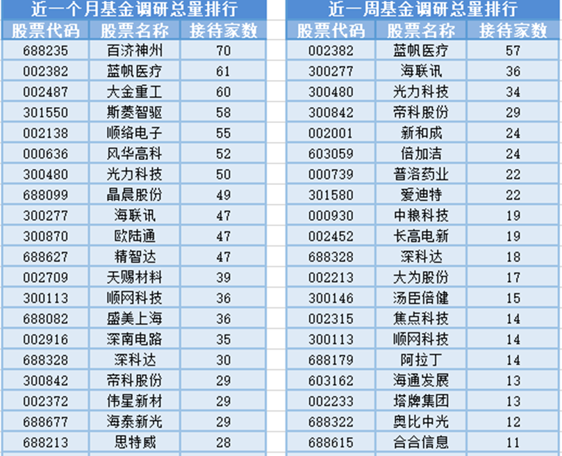 从个股调研情况上来看,最近1个月(2月21日-3月23日)最受公募基金关注的是百济神州,百济神州属于化学制药行业,主营业务为研究、开发、生产以及商业化创新型药物。共有70家基金管理公司参与调研,其次是蓝帆医疗和大金重工,分别接受61家、60家基金管理公司的调研。