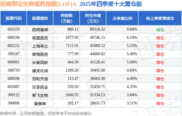 招商国证生物医药指数(LOF)A的前十大重仓股如下: