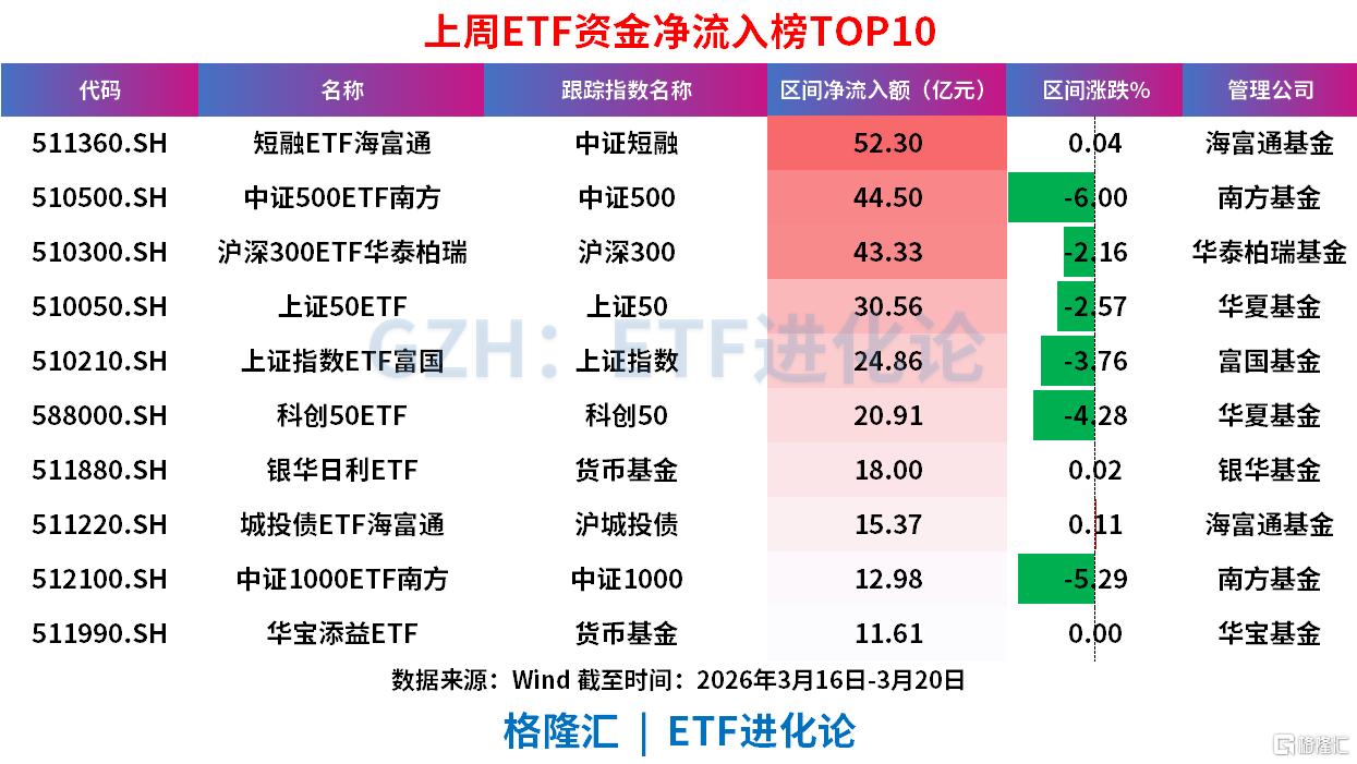 固收类产品领跑:短融ETF以52.30亿元净流入居首,货币基金、城投债ETF等固收类产品也获稳定流入,体现资金对低波动资产的偏好。