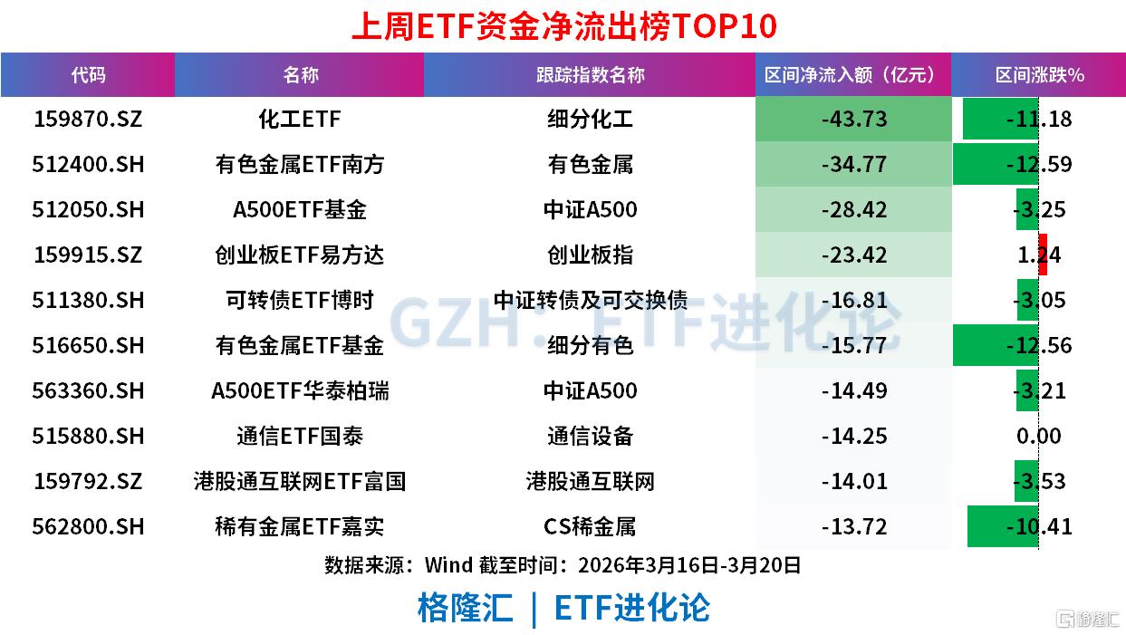 周期板块重挫:化工、有色金属、细分有色、稀贵金属等ETF集体大额净流出,且区间跌幅均超10%,呈现“量价齐跌”的恐慌性抛售。