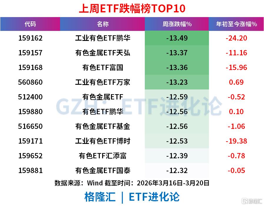 有色金属(工业有色、基本金属)全线暴跌,成为市场重灾区。工业有色、有色金属、有色ETF集体重挫,周跌幅均在12.32%-13.49%区间,其中工业有色ETF鹏华以-13.49%领跌。