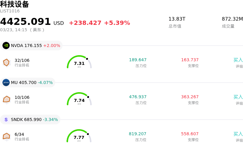 Dell Technologies Inc (DELL) 盘中上涨3.24%, 所属行业科技设备上涨5.39% ,公司涨幅跑输行业涨幅,行业成交额前三股票 英伟达 (NVDA) 上涨 2.00%;美光科技 (MU) 下跌 4.07%;闪迪 (SNDK) 下跌 3.34%。