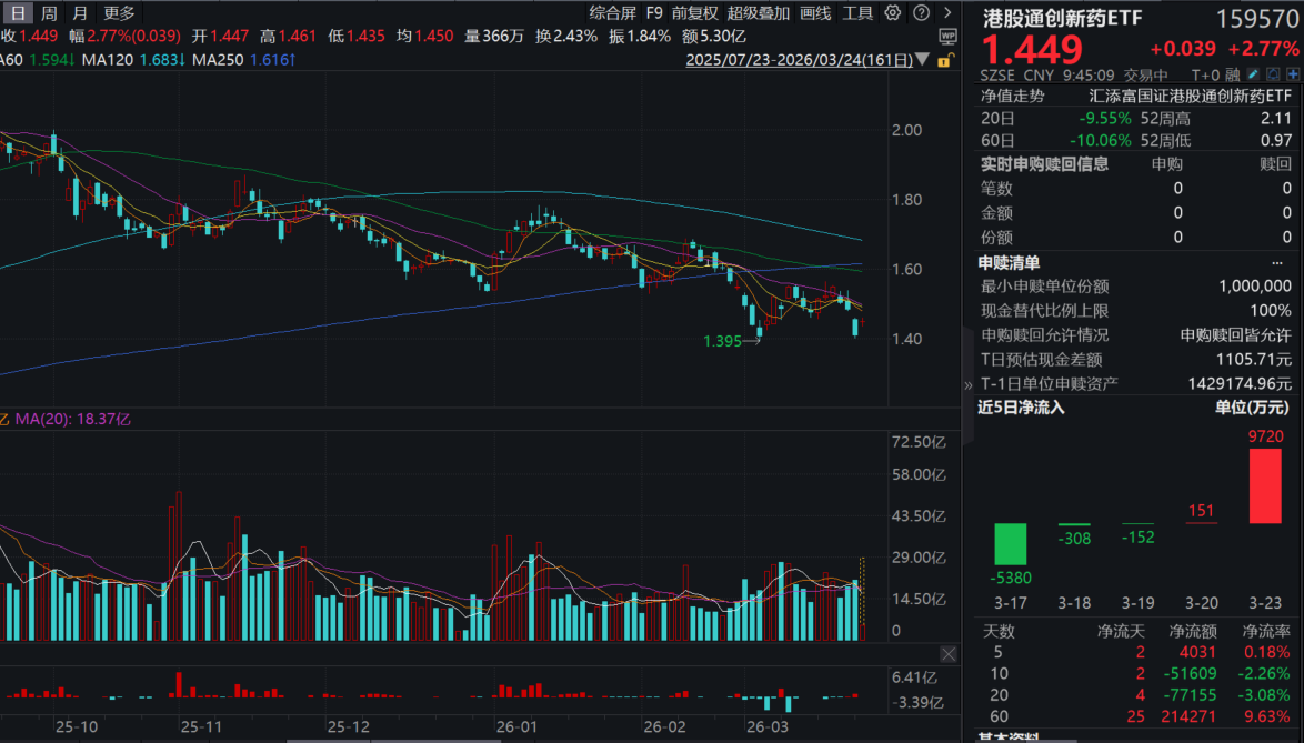 受全球局势影响,今日(3.24)港药大幅反弹,创新药纯度100%的港股通创新药ETF(159570)放量大涨近3%,盘中成交额超9亿元!资金昨日大举涌入近1亿元!最新规模超214亿元,同类遥遥领先。“20CM创新药新物种”科创创新药ETF汇添富(589120)放量狂涨4%,资金连续2日强势涌入!