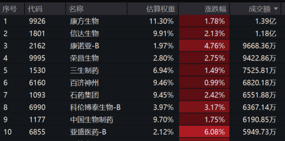 港股通创新药ETF(159570)标的指数热门股多数飘红:康诺亚-B涨超4%,信达生物、荣昌生物涨超2%,康方生物、三生制药涨超1%。