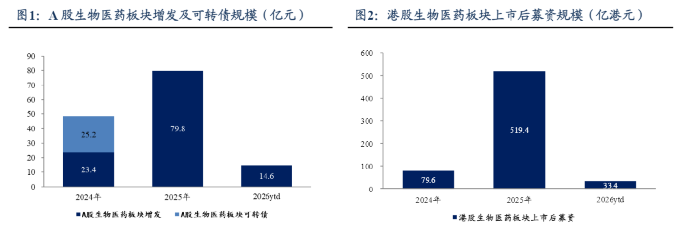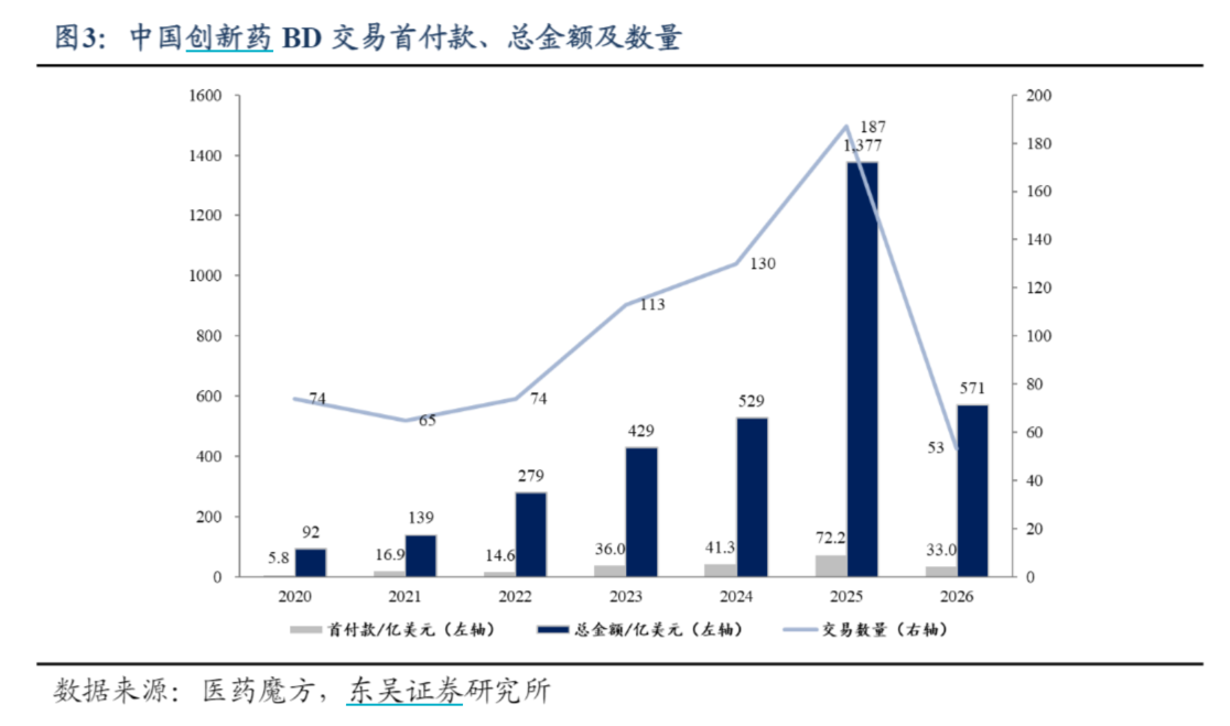 东吴证券指出,创新药板块资金充裕,研发投入可持续性强。BD收入及上市后募资为创新药企研发提供资金支持。2024/1/1-2026/3/21,港股及A股生物医药板块上市后募资约700亿元,支持创新药管线研发投入。2024/1/1-2026/3/21,A股生物医药板块通过增发融资总额为118亿元,通过发行可转债融资总额为25亿元。2024/1/1-2026/3/21,港股生物医药板块上市后募资总额为632亿港币。BD收入方面,截至2026/3/21,2026年中国创新药出海BD总包已经达571亿美元,首付33亿美元,数量达53件。BD收入已经成为中国创新药企重要资金来源。