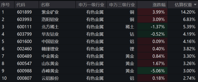 风险提示:基金有风险,投资需谨慎。投资人应当阅读《基金合同》《招募说明书》《产品资料概要》等法律文件,了解基金的风险收益特征,特别是特有风险,并根据自身投资目的、投资经验、资产状况等判断是否和自身风险承受能力相适应。基金管理人承诺以诚实信用、谨慎尽责的原则管理和运用基金资产,但不保证基金一定盈利或本金不受损失。以上基金属于较高风险等级(R4)产品,适合经客户风险承受等级测评后结果为进取型(C4)及以上的投资者。请投资者关注指数化投资的风险以及集中投资于细分有色指数成分股的持有风险,请关注部分指数成分股权重较大、集中度较高的风险,请关注指数化投资的风险、ETF运作风险、投资特定品种的特有风险等。文中提及个股仅为指数成份股客观展示列举,本文出现信息只作为参考,投资人须对任何自主决定的投资行为负责。本文中的任何观点、分析及预测不构成对阅读者任何形式的投资建议。