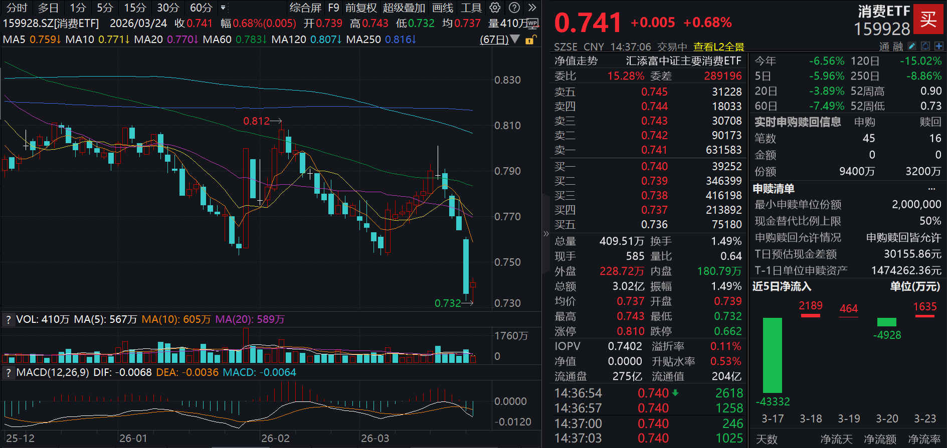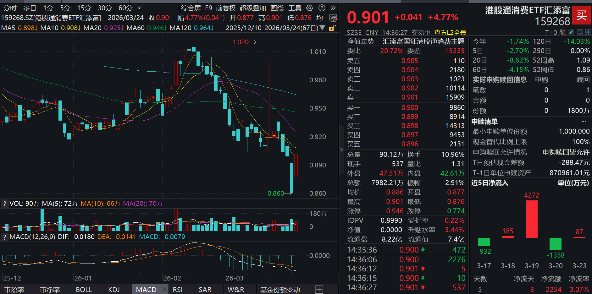 今日(3.24),港股消费午后大举反攻!聚焦纯正新消费的港股通消费ETF汇添富(159268)大涨4.77%,盘中成交额已超8000万元,大举放量!资金面上,近5日有3日获净流入,近10日累计“吸金”超4000万元!