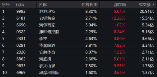 港股通消费ETF汇添富(159268)标的指数热门成分股多数飘红,老铺黄金涨超12%,康师傅控股涨超8%,华润啤酒涨超7%,泡泡玛特涨超5%。(成分股仅做展示,不作为个股推介)