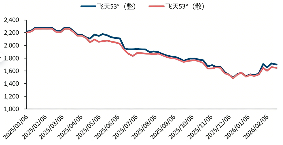 茅台批价触底:2025年茅台批价大幅下降,2026年春节前企稳回升,节后批价稳定在1600元上下。2025年飞天、普五批价大幅下降,根据今日酒价、酒价参考,12月飞天散瓶最低价格一度跌破1500元,普五批价也跌回820元左右,二线品牌原千元价位产品基本降价至700元价位。26年初茅台依托i茅台平台落地“全面向C”战略,从而实现春节期间动销、出货、批价、新客户开拓等全面超预期,批价重回1700元以上,节后普飞控量、并进一步落地非标代售政策,节后批价稳定在1600元上下,茅台批价底部基本确认。