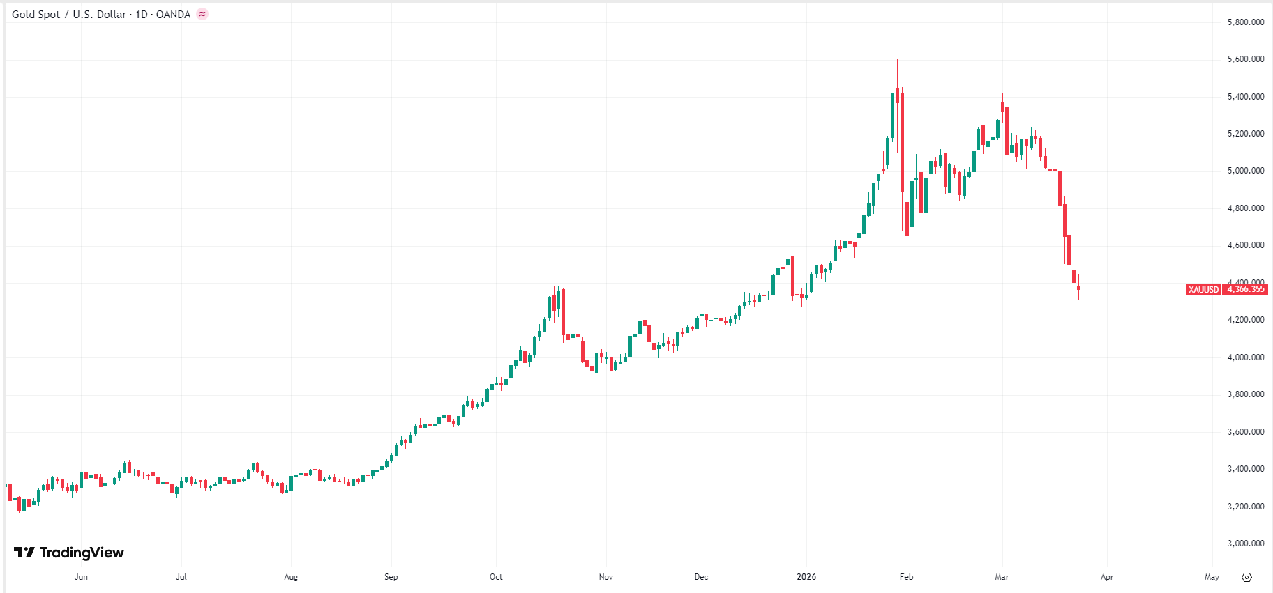 3月24日(GMT 8),金价的表现仍然疲软,现货黄金 (XAUUSD) 价格下跌约1%,当前价格为4,366美元/盎司。昨天,金价短暂暴跌至4,100美元,创下2025年11月以来新低,市场被恐慌情绪笼罩,担忧黄金价格再度失守4,000美元心理大关。