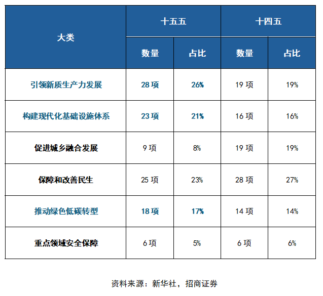 从以上变化中可以看出,发展新质生产力、构建新型基建、绿色低碳等方面将会是未来五年政策的重要发力点。