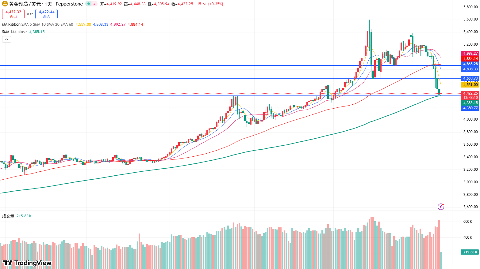 黄金日线图显示,昨日收盘虽然收阴线,但收出长下影线,同时,144日均线未被有效跌破,说明黄金整体趋势仍然看涨。今日金价虽然下探4300美元附近,但迅速拉回4400美元上方,意味着空头力量逐渐力竭,逢低买盘在持续进场。