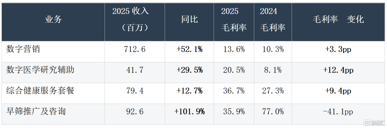 整体来看,四大业务线分工明确。数字营销是规模发动机,医学研究辅助和综合健康服务套餐是毛利率改善的来源,早筛服务是线下触点和数据入口,共同打造出规模与质效同步提升的增长模型,实现更健康、更多元的收入结构。