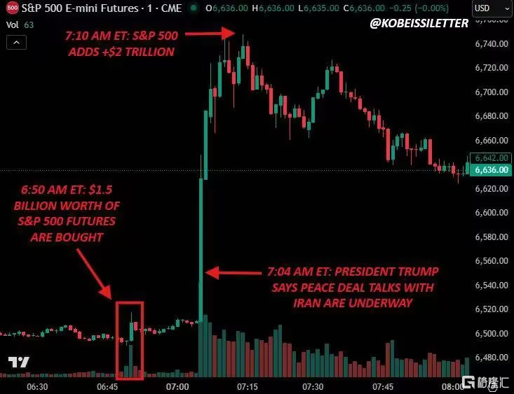 大约15分钟后,原油瞬间闪崩10几个点,标普500期货瞬间拉升3个点往上。如果上述交易在5分钟内平仓,合计获利将超过1亿美元。20分钟,赚了1个小目标,还是美元计。