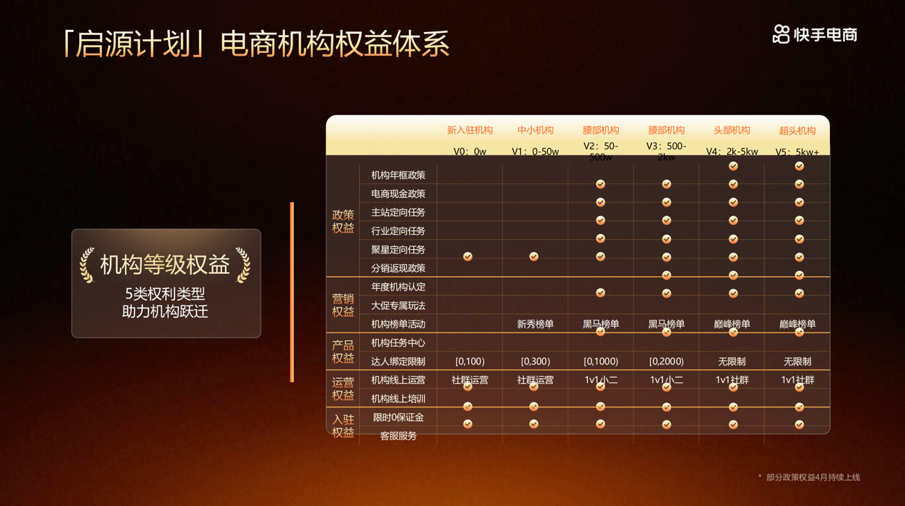 通过启源计划的发布,快手电商平台提供给机构众多的经营权益: