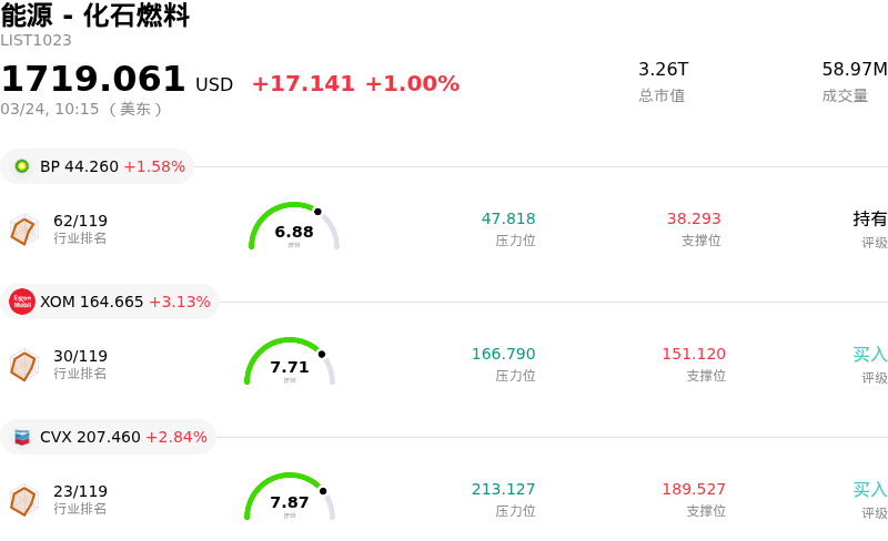 埃克森美孚 (XOM) 股价今日显著上涨,主要受到地缘政治局势紧张导致原油价格大幅飙升的推动。西德克萨斯中质原油 (WTI) 和布伦特原油价格均大幅攀升,其中 WTI 涨幅超过 4%,布伦特原油在 2026 年 3 月 24 日突破了每桶 100 美元。油价上涨在很大程度上归因于涉及美国、以色列和伊朗的中东冲突升级,这引发了市场对供应中断的担忧,特别是针对关键的霍尔木兹海峡。作为领先的能源公司,埃克森美孚是这种“高位运行更久”油价环境的直接受益者,预计这将显著提振其收益和自由现金流前景。