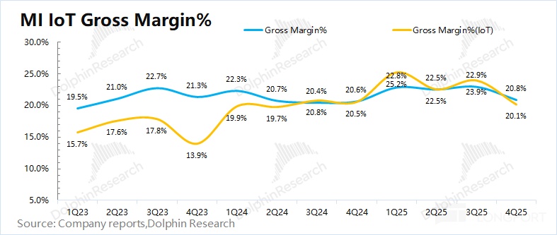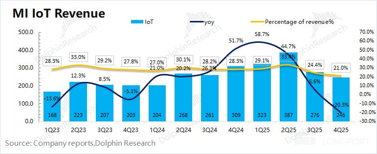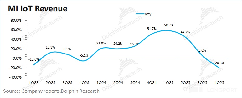 2025 年第四季度小米 IoT 业务实现营收 246 亿元,同比下滑 20%。受国补收紧的影响,IoT 业务中的大家电品类环比下滑 40%,对 IoT 业务带来较大 “拖累”。