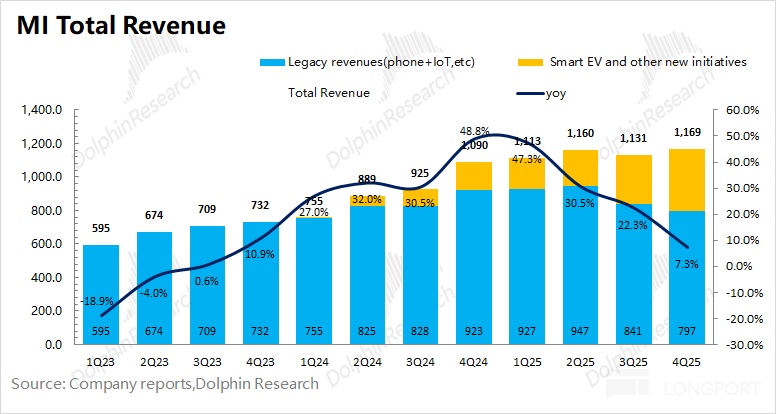 小米集团 2025 年第四季度总营收 1169 亿元,同比增加 7%,符合市场预期 1166 亿元,本季度增长主要来自于汽车业务。