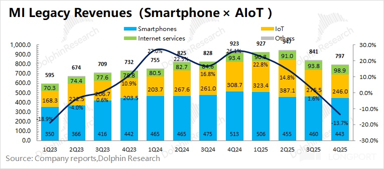 1)原本的业务——手机 X AIoT 业务(传统业务)实现营收 797 亿元,同比下滑 13.7%。其中硬件业务表现 “很差”,手机业务同比下滑 13.6%,IoT 业务同比下滑 20%;