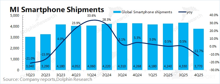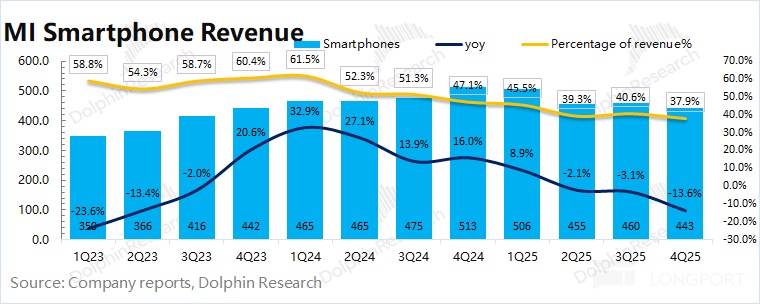 2025 年第四季度小米智能手机业务实现营收 443 亿元,同比下滑 13.6%,主要受存储涨价、国补收紧和竞争加剧的影响